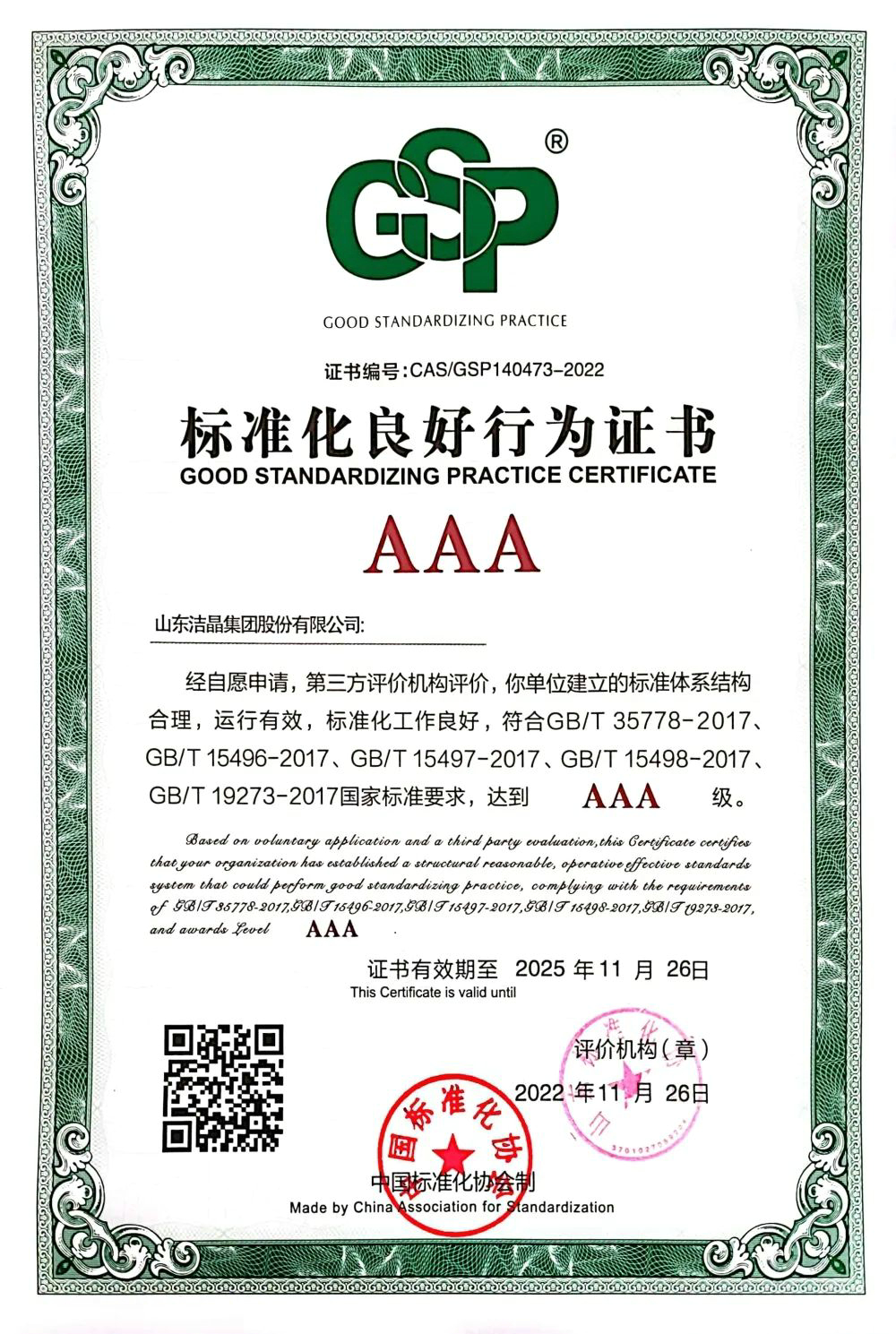 2022年11月26日,经前期申报及第三方评价机构评价审核,6776永利集团集团获得AAA级标准化良好行为证书。